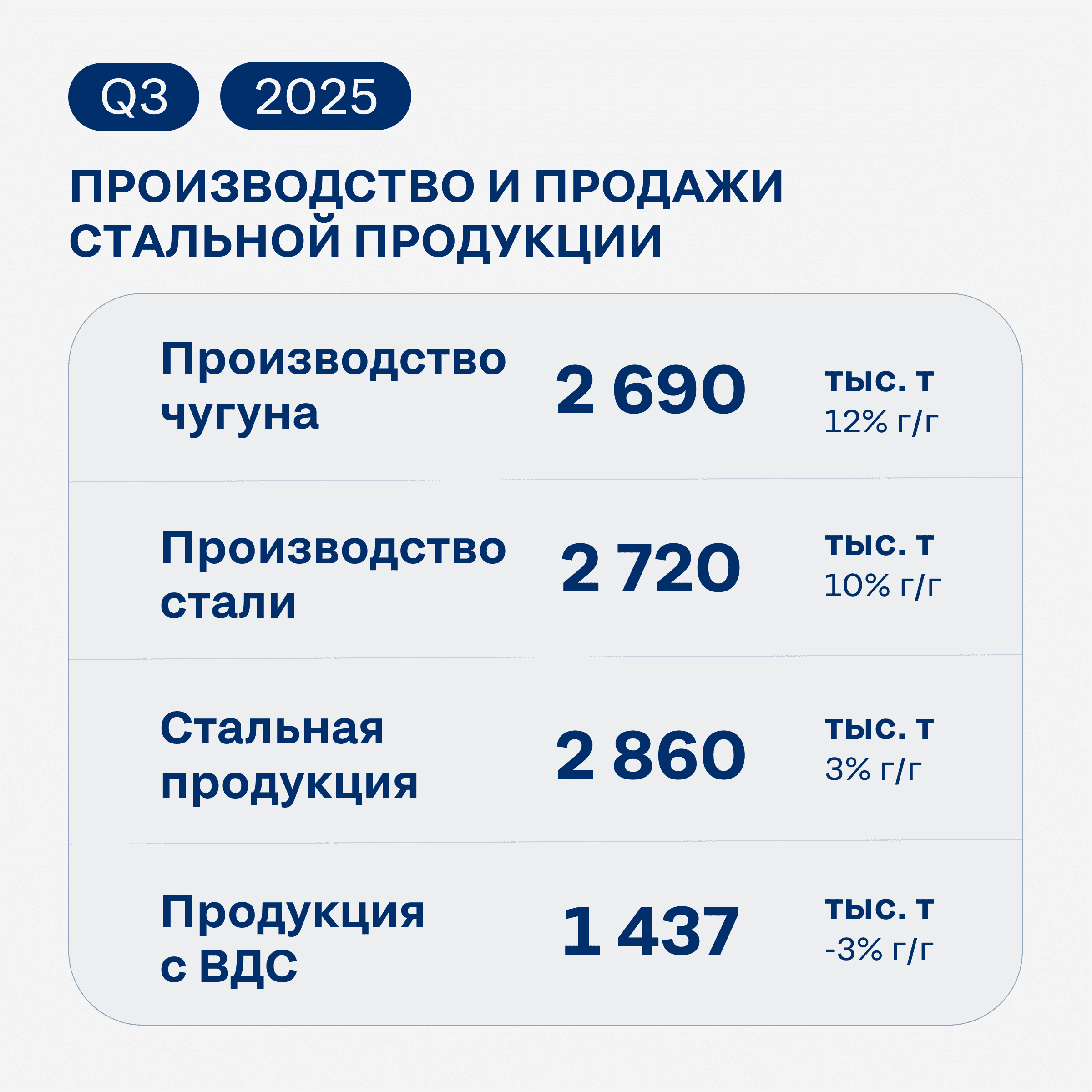 «В 3К 2025 года кризисные тенденции в российской и мировой металлургии продолжили нарастать. Внутренний спрос продолжал снижаться вслед за дальнейшим охлаждением экономики. За 9М 2025 года потребление металлопродукции в России сократилось примерно на 15%, и мы наблюдаем замедление деловой активности во всех ключевых отраслях-потребителях. На этом фоне средние котировки на горячекатаный прокат в 3К 2025 года снизились на 14% г/г. На мировых рынках также сохраняется слабый спрос, а продолжающийся рост китайского экспорта оказывает дополнительное давление на экспортные цены на сталь.