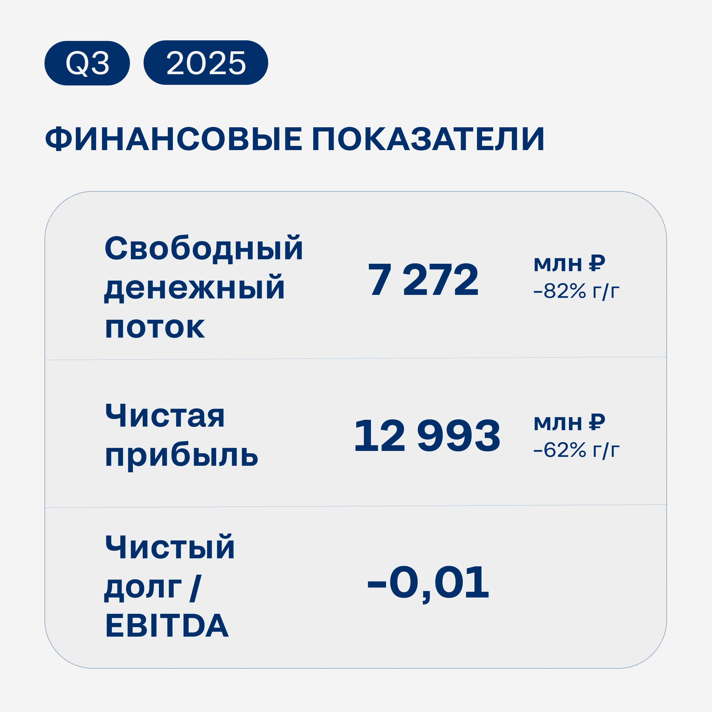 🔹 Свободный денежный поток снизился до 7 272 млн руб. (-82% г/г) за счет снижения показателя EBITDA и реализации масштабной инвестиционной программы.