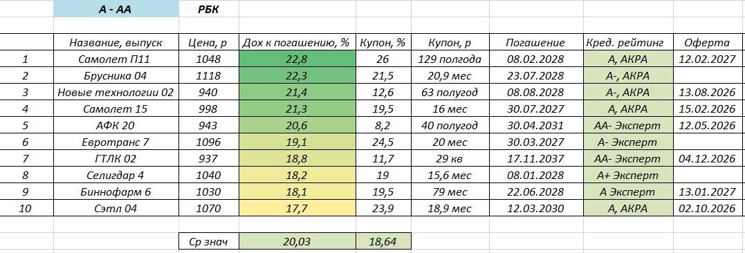 Кредитный рейтинг А и АА. Причем рейтинговые агентства АКРА и Эксперт РА. То есть можно сказать что бумаги относительно надежные. Средняя доходность к погашению около 20%, купонная доходность средняя 18,6%. Причем есть выпуски с купоном 8,2%, а есть и 24,5%. Есть и ложка дегтя – это оферта. В основном 2026-27 годы. Есть риск, что купон может быть снижен.Смущают так же очень длительные выпуски, например АФК 20 или ГТЛК 02 до 2031 и 2037 годов. Так же в списке есть компании с достаточно высокой долговой нагрузкой: ГТЛК, АФК, Селигдар, Евротранс, Самолет...