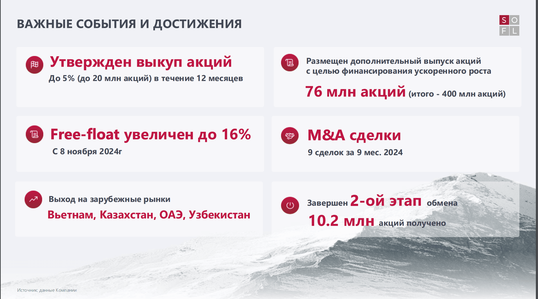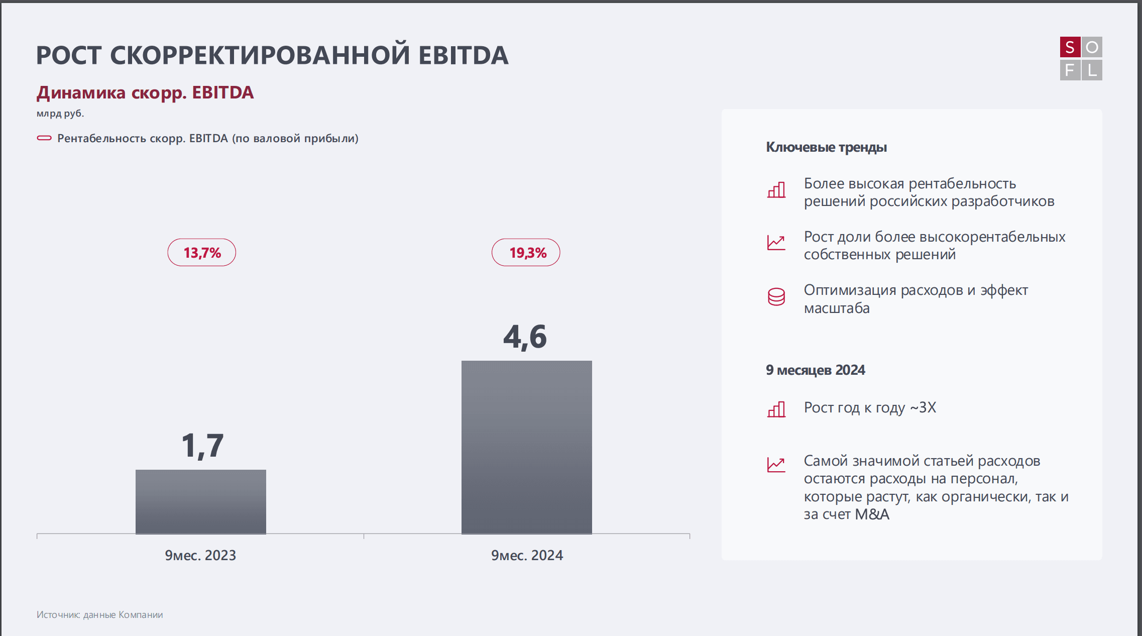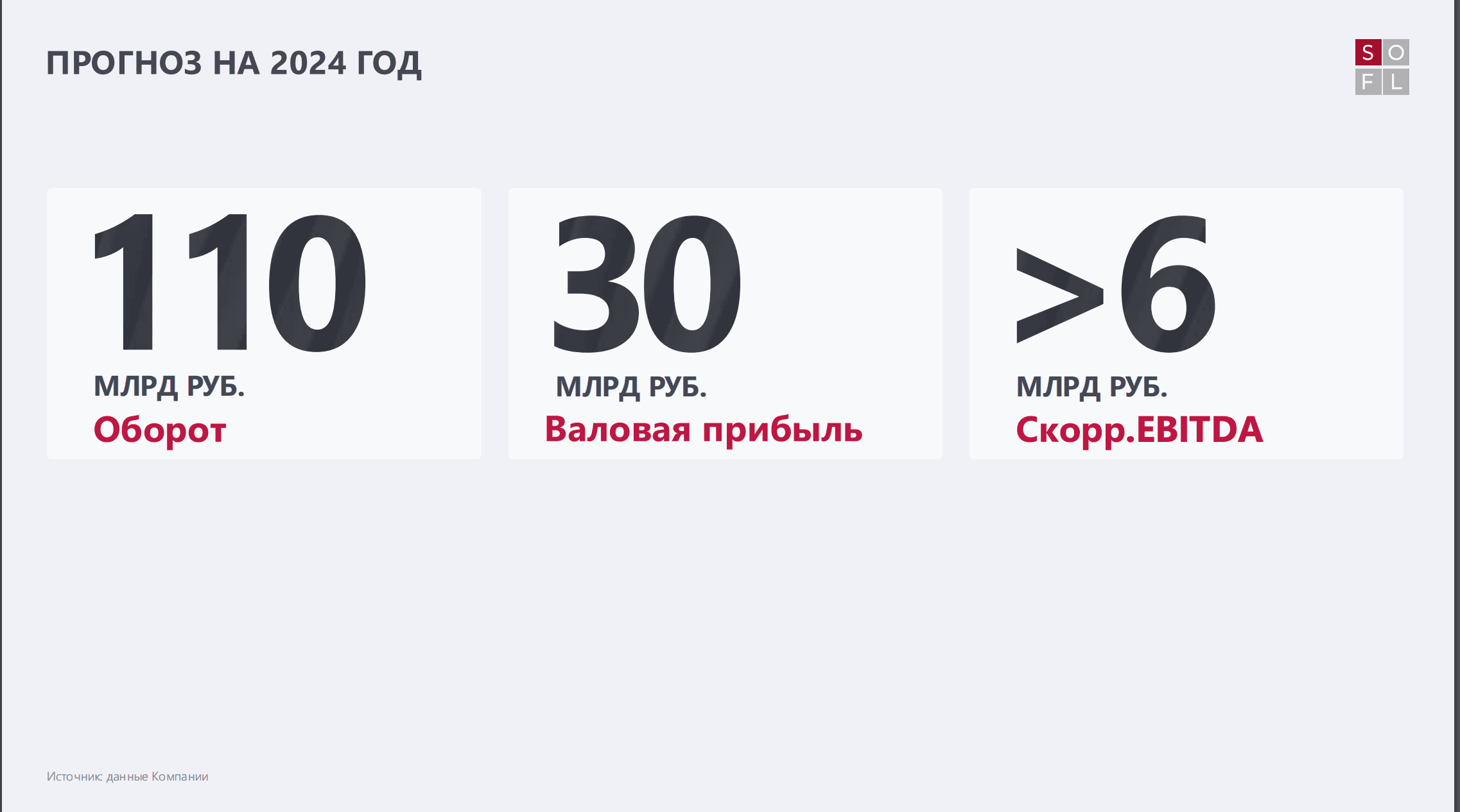 Компания обещает выплачивать стабильные дивиденды, а также стремиться стать лидером в данной отрасли. Компания сохраняет прогноз по обороту на конец 2024 года не менее 110 млрд рублей при скор. EBITDA, как минимум 6 млрд. Из барьеров является лишь высокая ставка ЦБ. Также SOFL поглотила 9 компаний за отчетный период и ставит одну из главных задач сократить долговую нагрузку