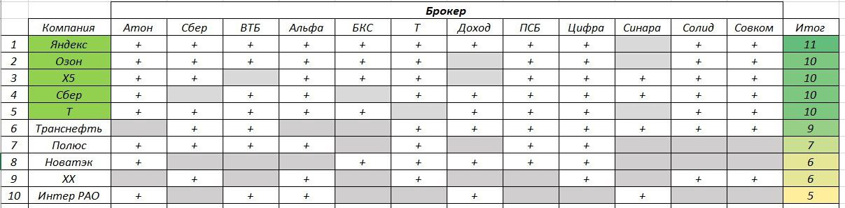 Причем 11 из 12 делают ставку на Яндекс. А на Озон, Х5, Сбер, Т делают ставку 10 из 12.