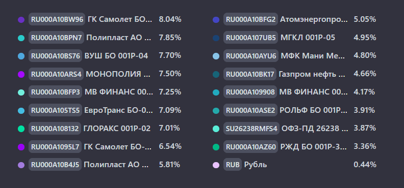 Инвестиционный портфель диверсифицирован под разные события на фондовом рынке. Помимо корпоративных выпусков, имеются валютные инструменты в качестве хеджа (фактор геополитики) и длинные ОФЗ (отыграть рост тела облигации на моменте перехода к циклу смягчения ДКП)