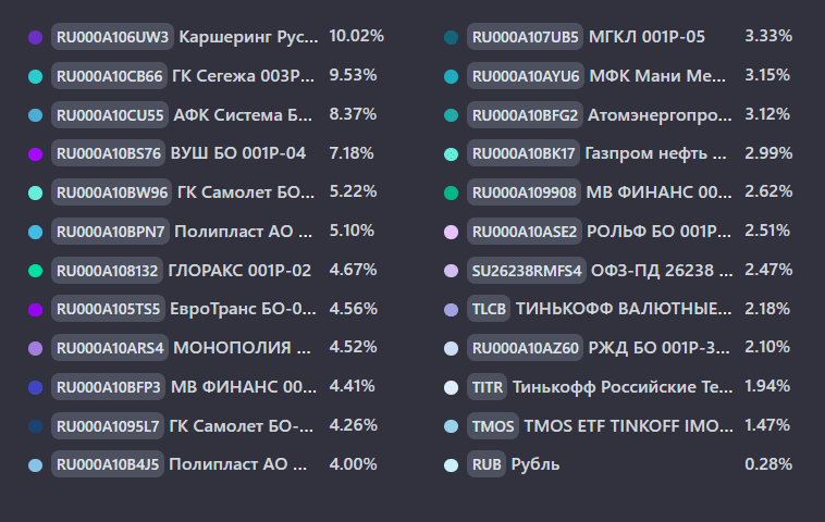 Инвестиционный портфель диверсифицирован под разные события на фондовом рынке: Помимо корпоративных выпусков, имеются валютные инструменты в качестве хеджа (фактор геополитики), длинные ОФЗ (отыграть рост тела облигации на моменте перехода к циклу смягчения ДКП) и фонды (на крупные компании, которые являются флагманами индекса МосБиржи).