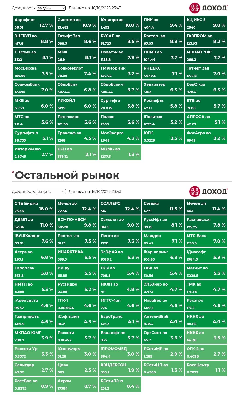 • Лидеры: СПБ Биржа #SPBE (+17%), Аэрофлот #AFLT (+9,3%), Татнефть #TATN (+8,6%), АФК Система #AFKS (+8,5%).