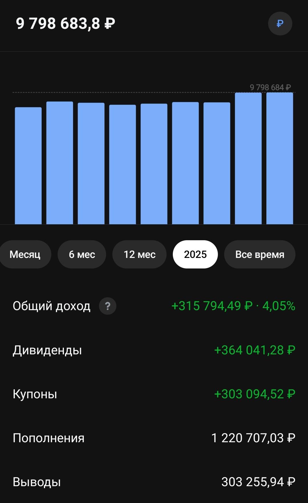 С начала года портфель вырос с примерно с 9 млн до 10 млн рублей. Это если учитывать все: акции, облигации, накопительные счета, вклады, валюта и т.д. Можно сказать, что программа минимум на этот год выполнена, но можно и лучше).