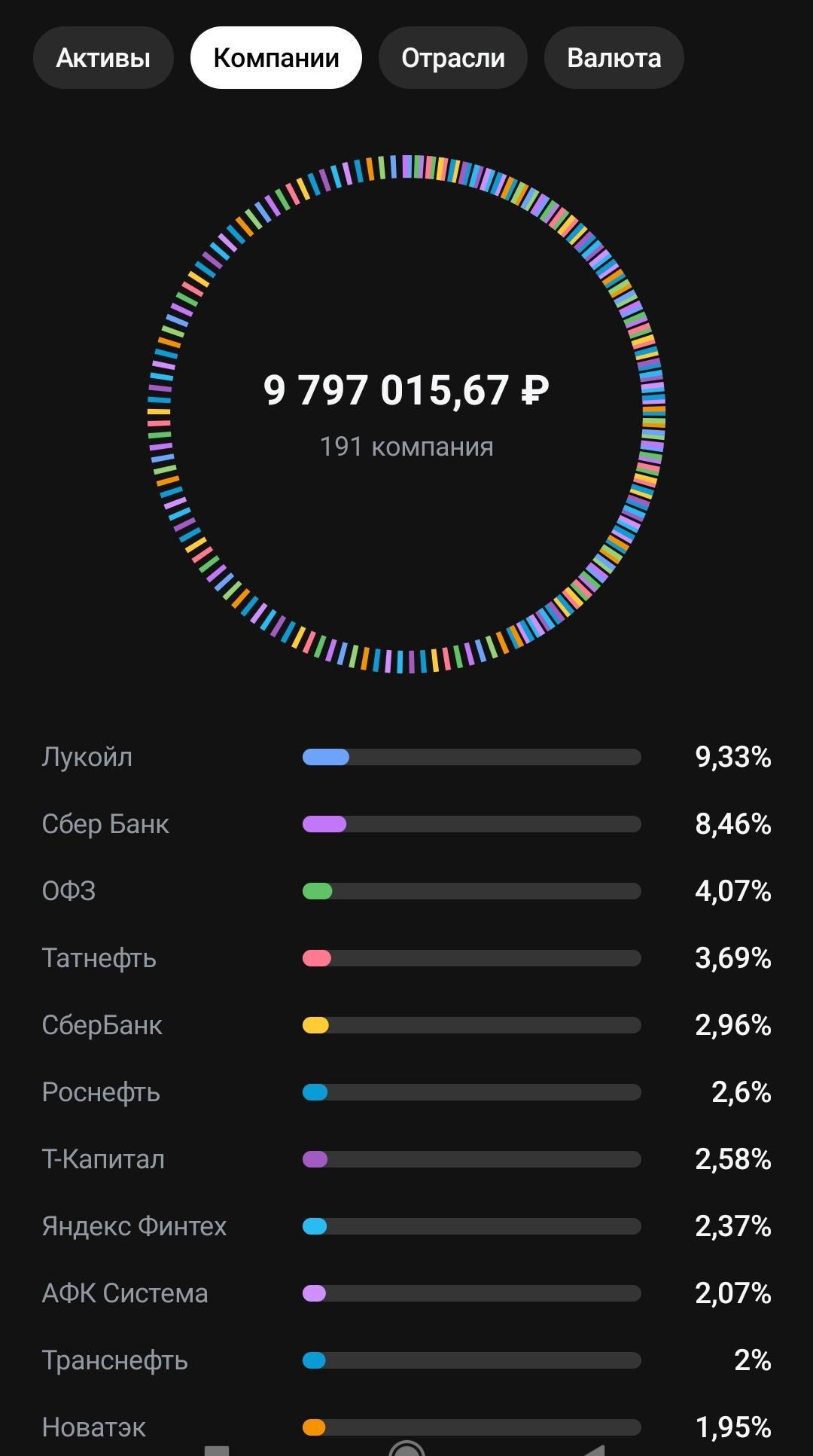Отдаю предпочтение компаниям, которые стабильно платят и повышают дивиденды. Самая большая доля - Сбер, Лукойл, Татнефть.