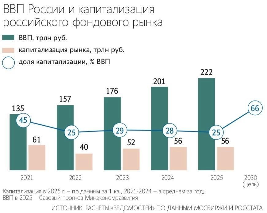 🪙 ЦБ РФ: Для достижения цели в 66% от ВВП к 2030 году рынок капитала РФ должен вырасти на ₽7–9 трлн — сейчас он лишь 26,6%. Необходимо преодолеть исторический перекос в сторону банковского кредитования при привлечении финансирования и возобновить IPO и SPO – Ведомости.