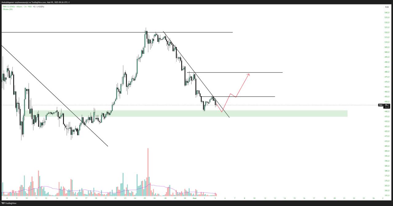 Цена актива сформировала негативную реакцию - максимумы снижаются, в случае если цена актива закрепится выше трендовой линии и закрепится выше максимума на 455, то актив станет интересен до отметок 477, так как ранее данный диапазон прошел импульсом.