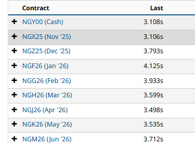 Фьючерсная кривая Henry Hub по состоянию на октябрь 2025 года остаётся глубоко наклонённой вверх: контракты зимнего сезона 2025/26 года торгуются на $0,45–0,55 выше текущих спотовых цен. Это означает, что трейдеры и производители продолжают использовать возможность для финансируемого хранения газа, продавая дальние фьючерсы и удерживая физические запасы в ожидании зимнего спроса.