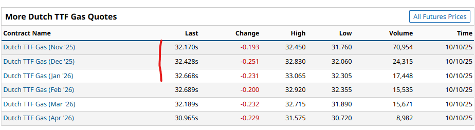 Параллельно с этим контанго на TTF постепенно сглаживается (прирая форму флэта), что говорит о снижении арбитражных возможностей между американским и европейским рынками. Как представлено на скриншотах фьючесры на базисе Хенри Хаб показывают сильное контанго, при флэте во фьючерсах в Нидерландах.