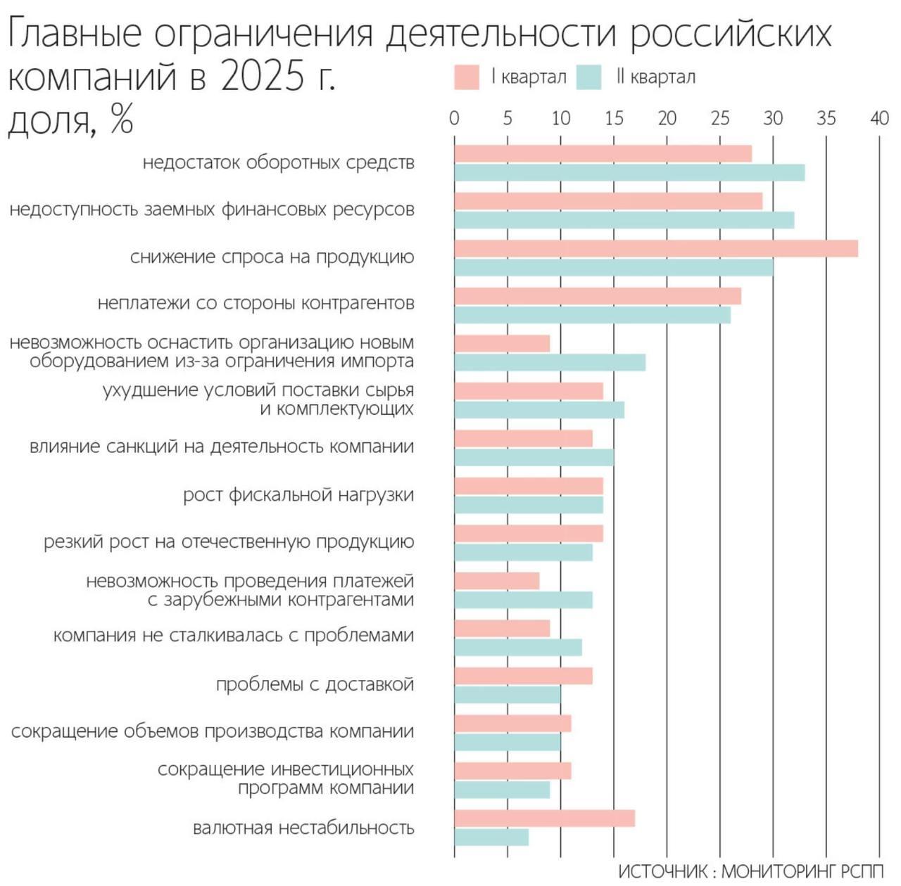 🪙Главной проблемой бизнеса во II кв 2025 года стала нехватка оборотных средств — её назвали 33% компаний, следует из мониторинга РСПП — Ведомости