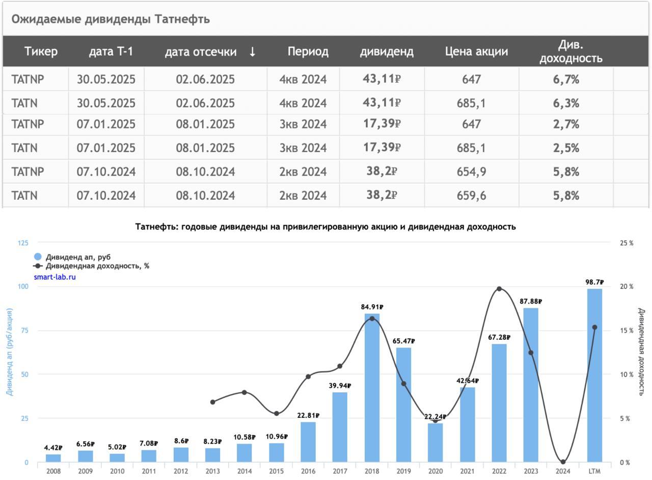 🤑 Татнефть традиционно выплачивает дивиденды трижды в течение года, исходя из расчета 50% от наибольшего показателя чистой прибыли по международным стандартам отчетности (МСФО) либо российским бухгалтерским стандартам (РСБУ). Впрочем, практика показывает, что компания нередко платит своим акционерам даже больше установленного норматива. Такая возможность крупных выплат возможна благодаря отсутствию долгового бремени и высокому уровню свободного денежного потока компании.