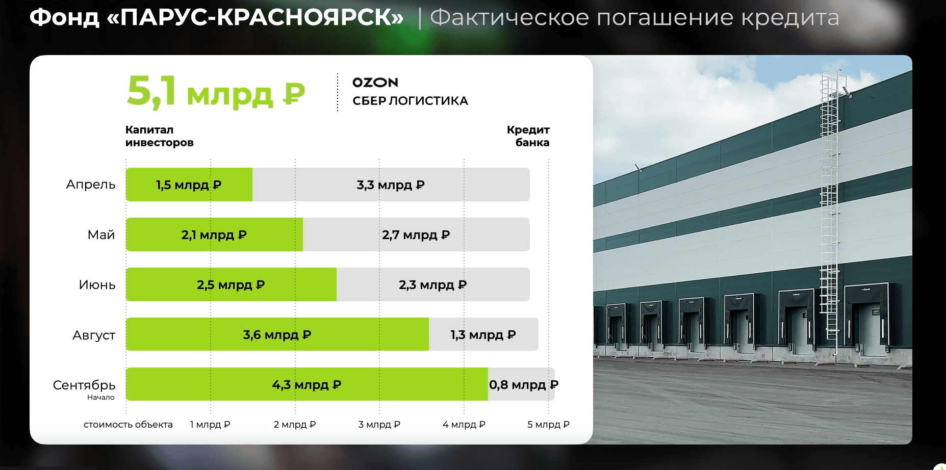 Комплекс на старте состоял из двух очередей общей площадью 65 000 кв. м. Якорные контракты заключены с лидерами рынка — Ozonи Сберлогистика. Стоимость квадратного метра при запуске фонда составляла 73 000 рублей, сейчас текущая рыночная стоимость логистической недвижимости колеблется в диапазоне 75 000 – 100 000 рублей.