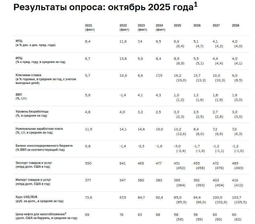— По итогам октябрьского опроса Банк России сообщил о существенном ужесточении прогнозов аналитиков. Медианный прогноз по ключевой ставке на 2026 год повышен на 0,5 п.п. до 13,7%, а по инфляции на конец года — на 0,4 п.п. до 5,1%. При этом ожидания роста экономики снижены: прогноз по ВВП на 2025 год уменьшен на 0,2 п.п. до 1,0%, а на 2026 год — на 0,4 п.п. до 1,2%.