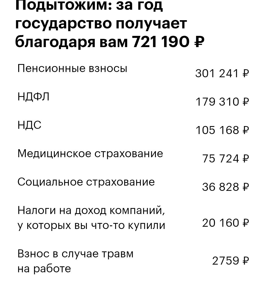 Ну а если вы употребляете алкоголь, курите, водите автомобиль, то государство получает с вас около 778 тыс рублей. На 57 тыс больше ежегодно. Думаю что это хорошая причина отказаться от алкоголя и сигарет. Так больше денег останется вам... Если конечно их не потратить на что-то ещё).