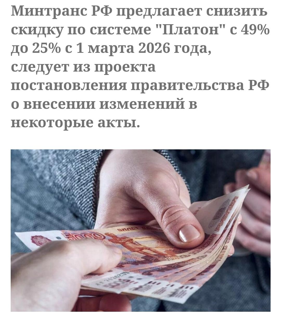 Минтранс РФ предлагает снизить скидку по системе «Платон» с 49% до 25% с 1 марта 2026 года. Это позволит пополнить бюджет страны на 242,9 млрд рублей до 2030 года, следует из проекта постановления правительства России.