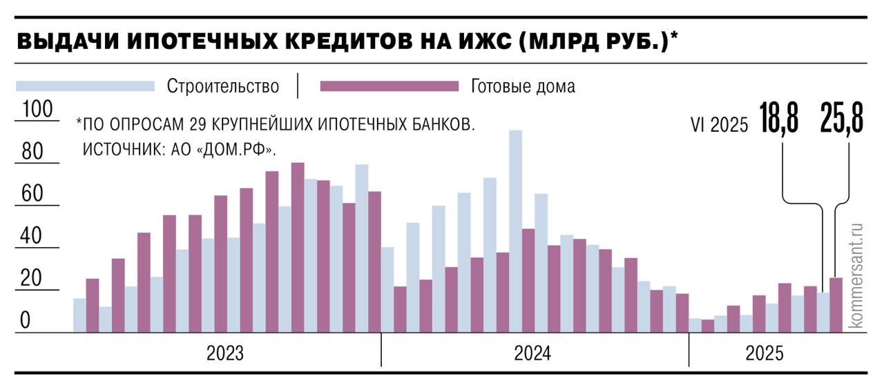 🪙 Объем ипотечных кредитов на ИЖС и покупку готовых домов в июне достиг ₽45 млрд — максимум за 7 месяцев. Основной драйвер рынка — льготные программы, на которые приходится 98% всех выдач — Ъ
