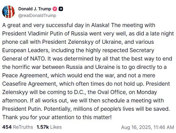 🪙 Трамп заявил, что в результате встречи с Путиным и телефонных разговоров с Зеленским и европейскими лидерами «все пришли к выводу», что лучший способ урегулировать конфликт — это перейти к мирному соглашению, а не к обычному соглашению о прекращении огня.