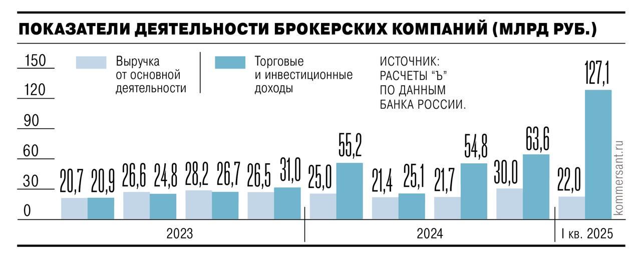 Доходы российских брокеров от инвестопераций в I кв 2025 г. выросли в 2,1 раза — до ₽127 млрд. Основная причина — размещение клиентских остатков на банковских депозитах и инструментах денежного рынка на фоне высокой ключевой ставки.