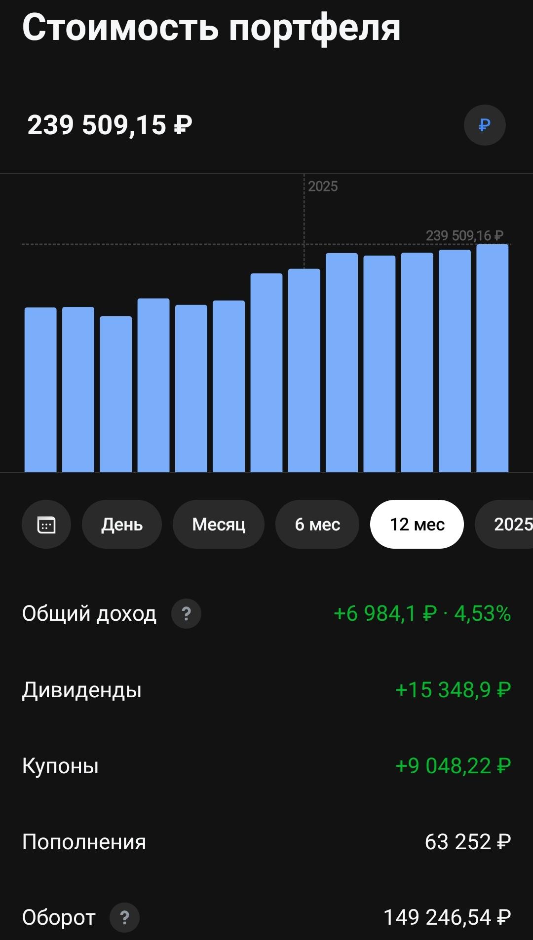 💡Отчет за январь – февраль 2025 года. Давно не делал больших полноценных отчетов по своему портфелю. Не знаю, стоит ли их вообще делать? Пишите свое мнение. С начала года портфель вырос с 8855 до 9327 тыс рублей. Рост составил 472 тыс рублей. А с начала 2024 года – 1933 тыс рублей. Тут конечно же решают пополнения, дивиденды, купоны и концентрация в отдельных бумагах. Хотя конечно же все не растет так как я хотел бы). Индекс Мосбиржи с конца декабря 2024 года вырос уже на 36 процентов, так что по сути все выросло. А если вы еще и покупали акции начиная с мая 2024 года и не продавали их, как это делал я, то этот рост вы вряд ли пропустили. $TMOS Основным драйвером роста остается геополитика. Поэтому для многих торговля по новостям – это сейчас самое простое и результативное. Впереди еще и дивидендный сезон. Ожидаются высокие урожаи, надои, но компании отчитываются с переменным успехом. Скорее все в ожидании перемирия и снижения ключевой ставки. Хотя прогнозы неоднозначные. Думаю что перемирие все равно наступит, возможно даже скоро. А ставку все равно снизят, возможно даже в этом году. Вот такой максимально расплывчатый прогноз). Отдельные небольшие портфели ( Пенсионный, #pocket_money, облигационный) пока так же неплохо растут. Стратегии тоже в росте и пробивают свои исторические максимумы. &Пенсионный портфель RUB &Облигационная пенсия В августе 2024 года я писал, что «если держать крепкие компании без сильных проблем с долгами, то можно жить с этим достаточно долго. Дивиденды будут платиться, а все остальное со временем нормализуется. Рынок начнет расти, тогда можно будет и выкупать падение. Кэш есть, его я специально держу под эти цели». Пока все идет по плану. 💡Купоны. Дивиденды. За январь получил в виде дивидендов 25,4 тыс рублей, а купонами 31,2 тыс. За февраль – дивиденды – 0,4 тыс, купоны - 32,8 тыс. Февраль исторически не очень дивидендный месяц. Но зато купонная доходность понемногу растет. По сравнению с прошлым годом видно существенный рост. Всего за 2 месяца – 89,9 тыс рублей. Основные дивиденды получил от Татнефти, Роснефти и Фосагро. Думаю что див доходность большого дивидендного сезона должна порадовать больше, чем в прошлом году. Все дивиденды и купоны продолжаю реинвестировать. Всем хорошего дня.