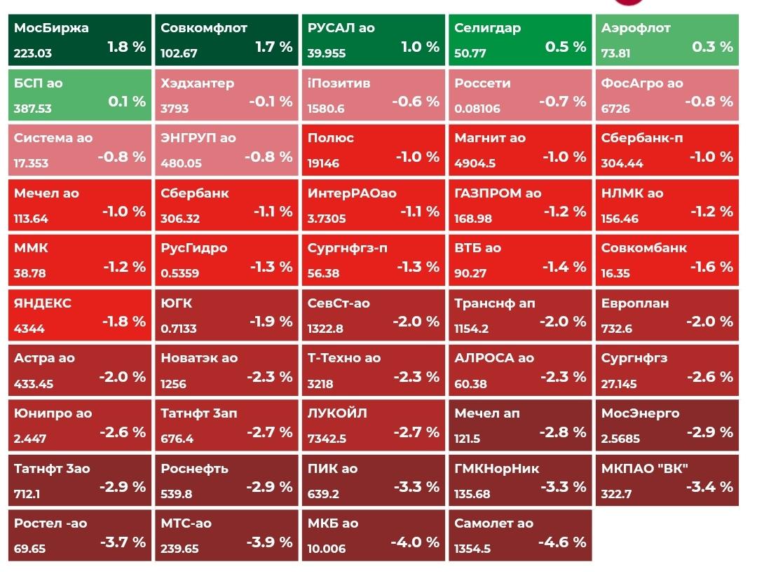 • Аутсайдеры: Русал $RUAL (-4,26%), Ростелеком $RTKMP (-4,04%), Позитив $POSI (-3,9%).