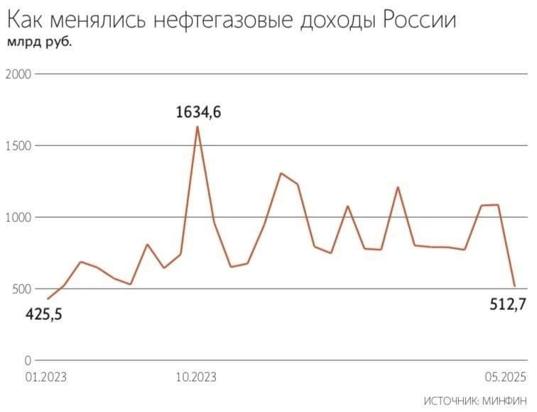 🪙 Нефтегазовые доходы бюджета в мае упали на 35% г/г, составив ₽513 млрд — самый низкий показатель с января 2023 г. Главные причины — падение цен на нефть и крепкий рубль.